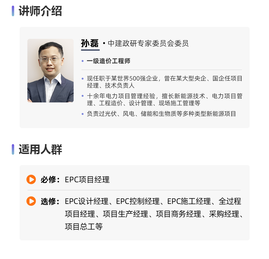 选修人群:EPC设计经理、EPC控制经理、EPC施工经理、全过程项目经理、项目生产经理、项目商务经理、采购经理、项目总工等