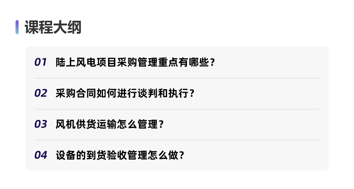随着全球对清洁能源需求的不断增长,陆上风电项目作为重要的可再生能源之一,其建设与发展日益受到重视。本系列课程从陆上风电项目全过程管理角度出发,帮助学员了解陆上风电项目设计、采购和施工管理过程中的常见问题,掌握解决和应对方法,提升对陆上风电项目全过程管理的理解和实践能力。