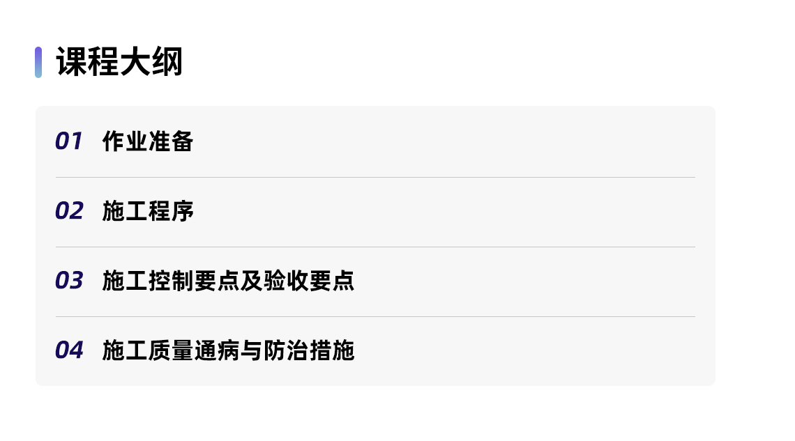 本课程结合重难点项目案例,添加大量现场图片,详细介绍了地铁车站装饰装修工程的施工工艺、施工技术、控制要点、验收要求,帮助学员掌握施工技术及质量控制要点。
