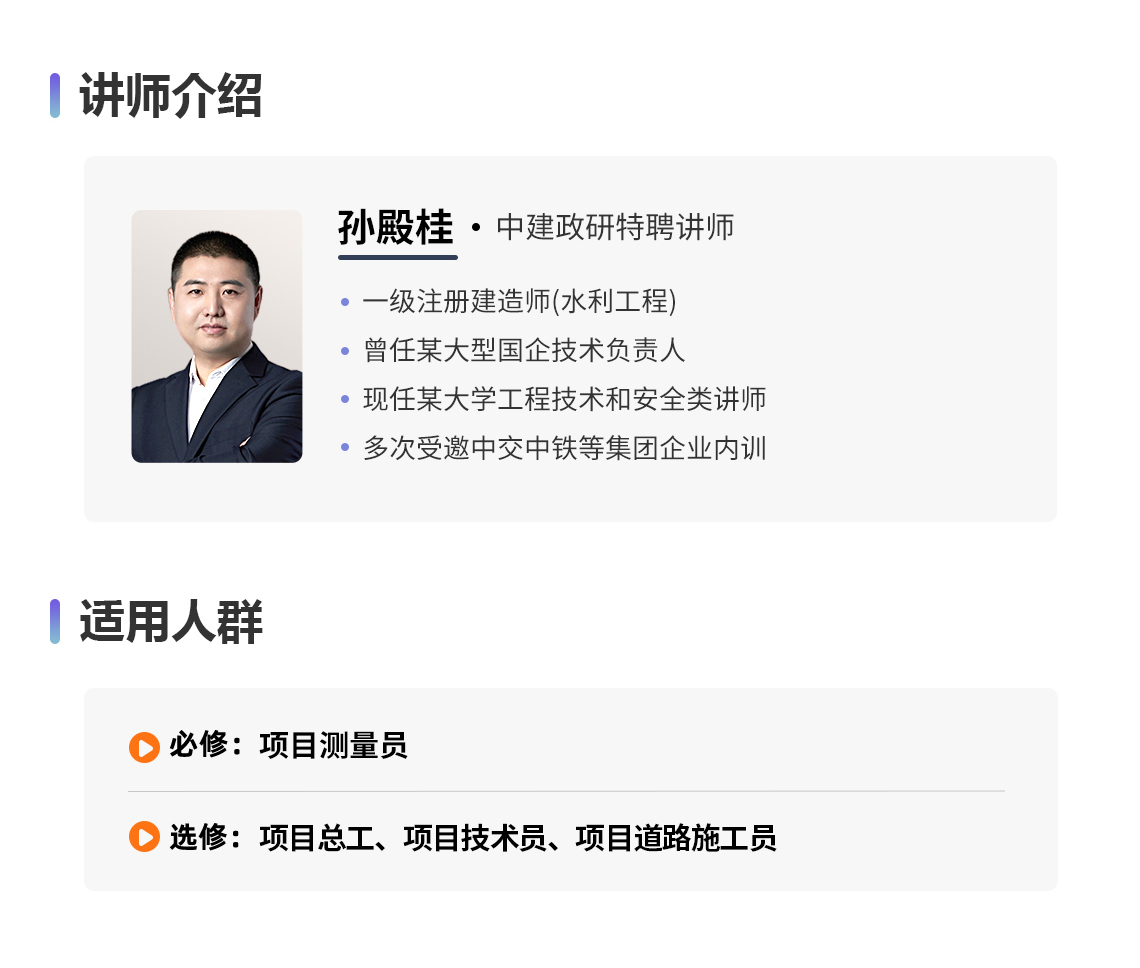 市面上的测量课多为理论结合案例讲解,本系列课录制地点不再局限于录课室,而是实际的项目中,讲师对仪器的操作、测量的方法进行实景演示,帮助学员更为直观地感受测量工作进行步骤,掌握测量全流程具体的操作方法。
