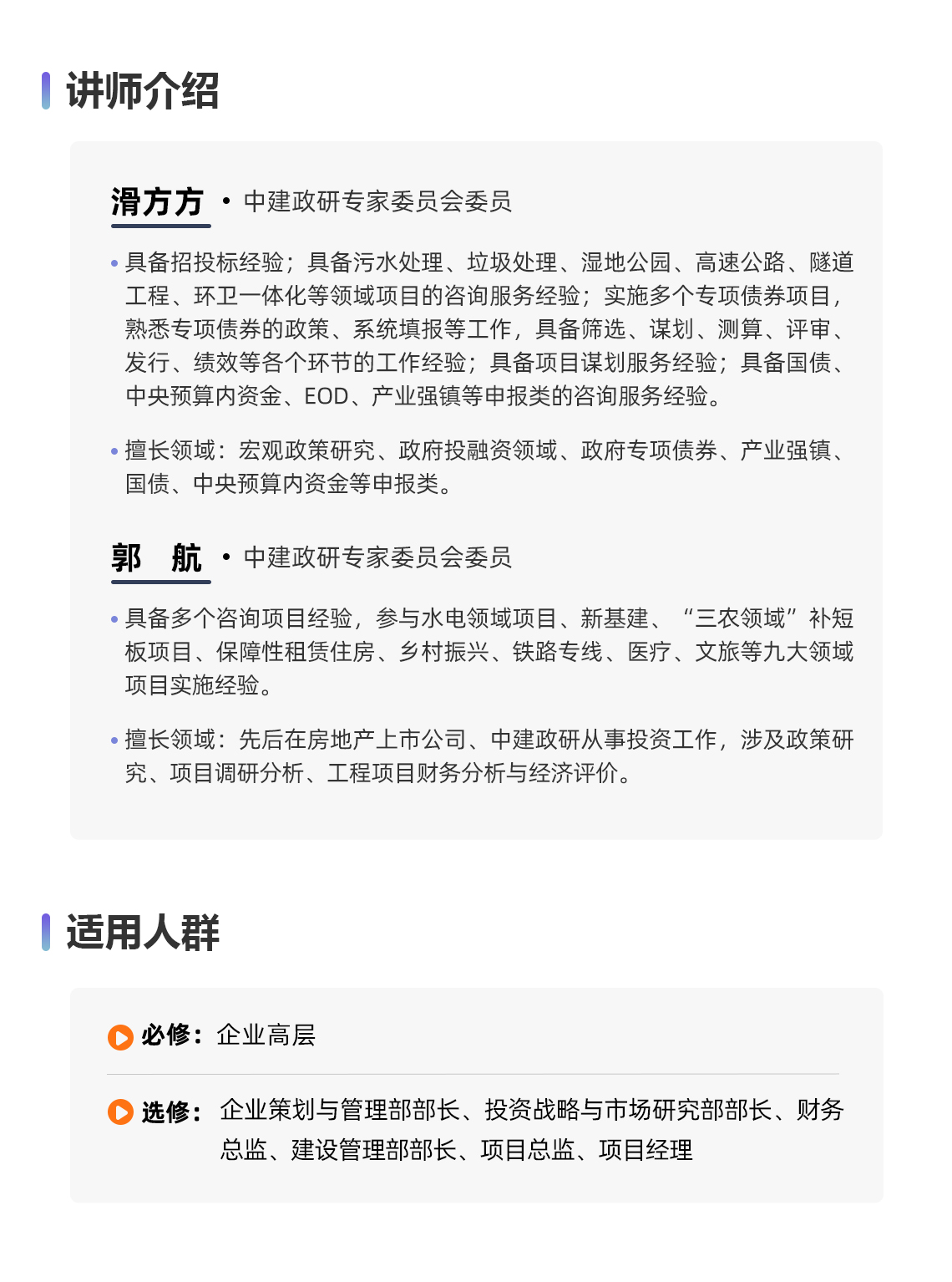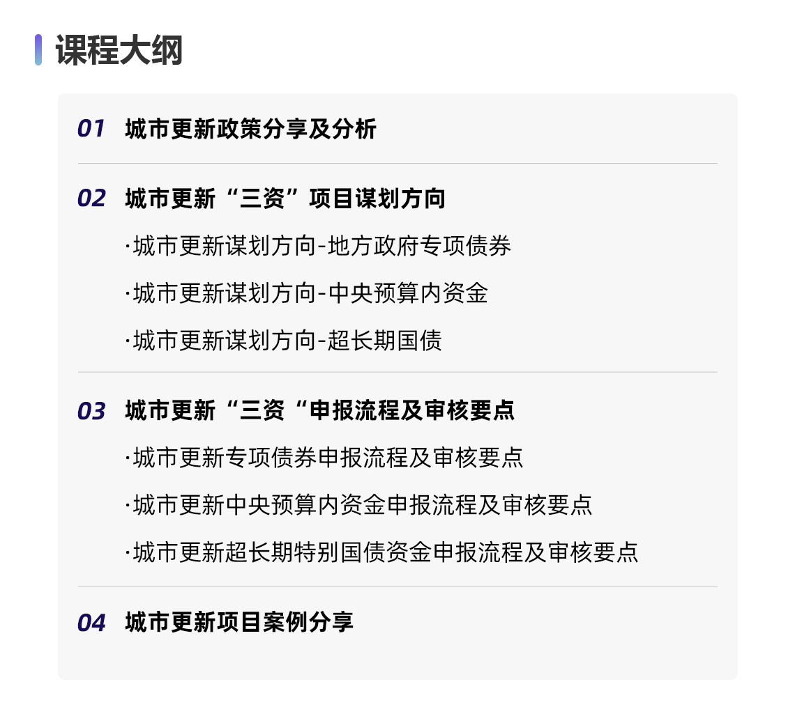 本课程聚焦当前城市更新领域的政策热点与资金机遇,系统解读政府专项债券、中央预算内投资、超长期特别国债等“三资”申报要点。课程结合最新政策文件与实战案例,深入剖析项目谋划方向、申报流程及审核关键,帮助学员掌握项目包装、资金拼盘与申报技巧,提升项目获批成功率,助力城市焕新与高质量发展。