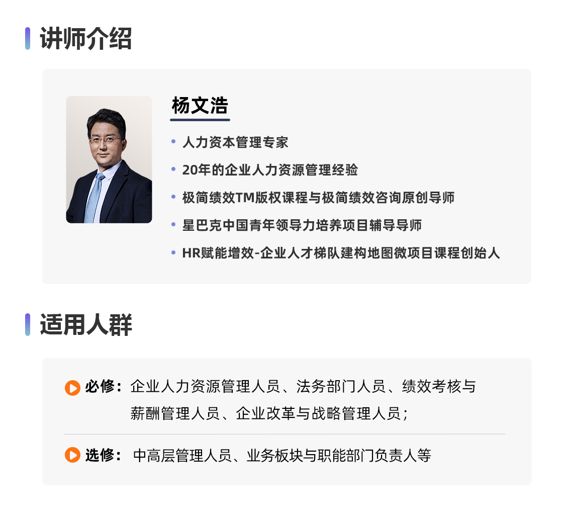 必修人群:企业人力资源管理人员、法务部门人员、绩效考核与薪酬管理人员、企业改革与战略管理人员