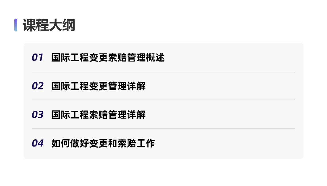 本课程聚焦国际工程变更与索赔核心痛点,构建全流程知识体系。通过系统解析变更与索赔的本质区别、法律依据及内在关联,夯实从业人员专业基础;逐层拆解不同合同体系(FIDIC、AIA、ICE)下变更与索赔的条款要求、诱因识别、权责界定、流程推进及价款 / 费用确定规则,传授实操核心技能;聚焦索赔证据链构建、报告撰写、争议解决等关键环节,强化攻坚能力;同时指导建立内部协作机制,助力企业将变更索赔转化为 “二次经营” 常态化利润增长点,提升国际工程履约竞争力与风险管控水平。