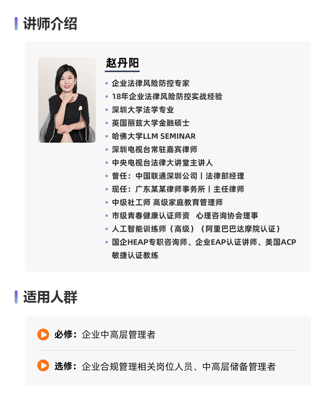 选修人群:企业合规管理相关岗位人员、中高层储备管理者