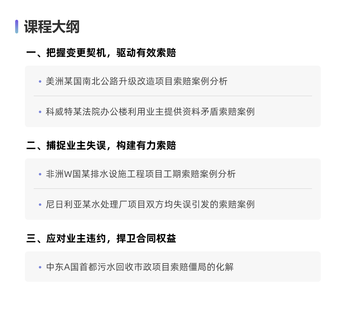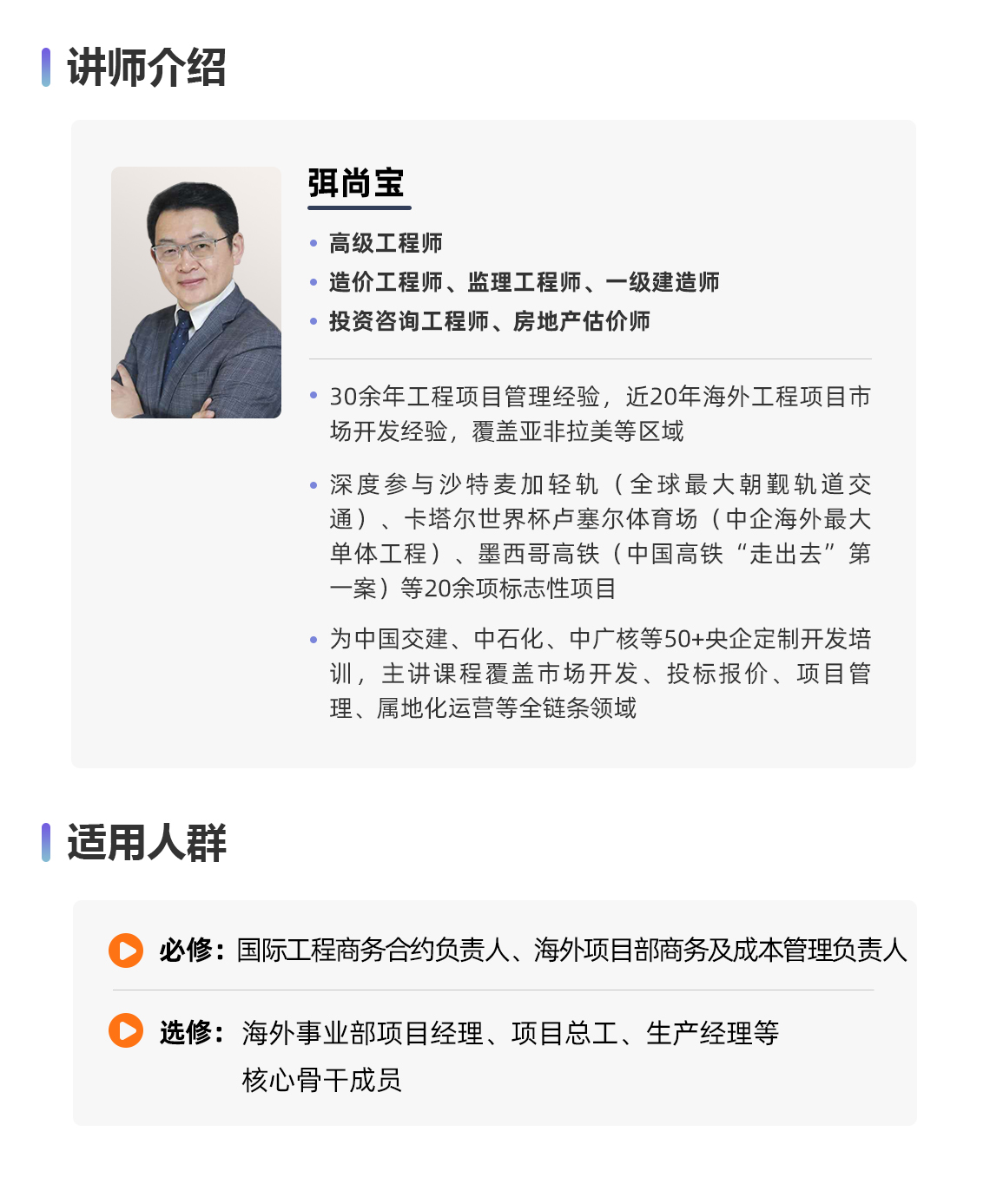 必修人群:国际工程商务合约负责人、海外项目部商务及成本管理负责人