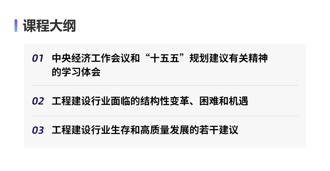 本课程聚焦中央经济工作会议精神与“十五五”规划建议,系统学习国家宏观政策方向,深入分析工程建设行业在“两重”建设、城市更新、绿色低碳等领域的挑战与机遇,并结合行业实际提出业务布局优化与能力建设的具体路径,助力企业把握趋势、推动高质量发展。
