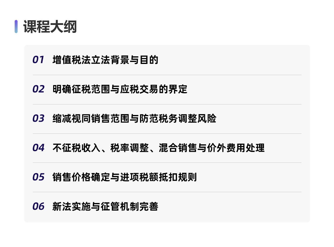 2026年1月1日《中华人民共和国增值税法》与《中华人民共和国增值税法实施条例》同步正式施行。本次立法并非简单平移,而是在巩固营改增成果、优化税制结构、回应征管实践的基础上,对增值税制度进行了系统性整合与重要调整。这些变化将深刻影响所有纳税人的计税管理、发票处理、纳税申报和风险控制。对于广大纳税人及涉税专业服务者而言,系统、准确、前瞻地掌握新法新规的核心要义与实操要领,已成为当前工作的重中之重。本次课程将《增值税法》、《增值税法实施条例》核心条款变化进行解读,助力纳税人合规处理税务实务,提前做好涉税安排,防范税务风险,应享尽享政策红利。