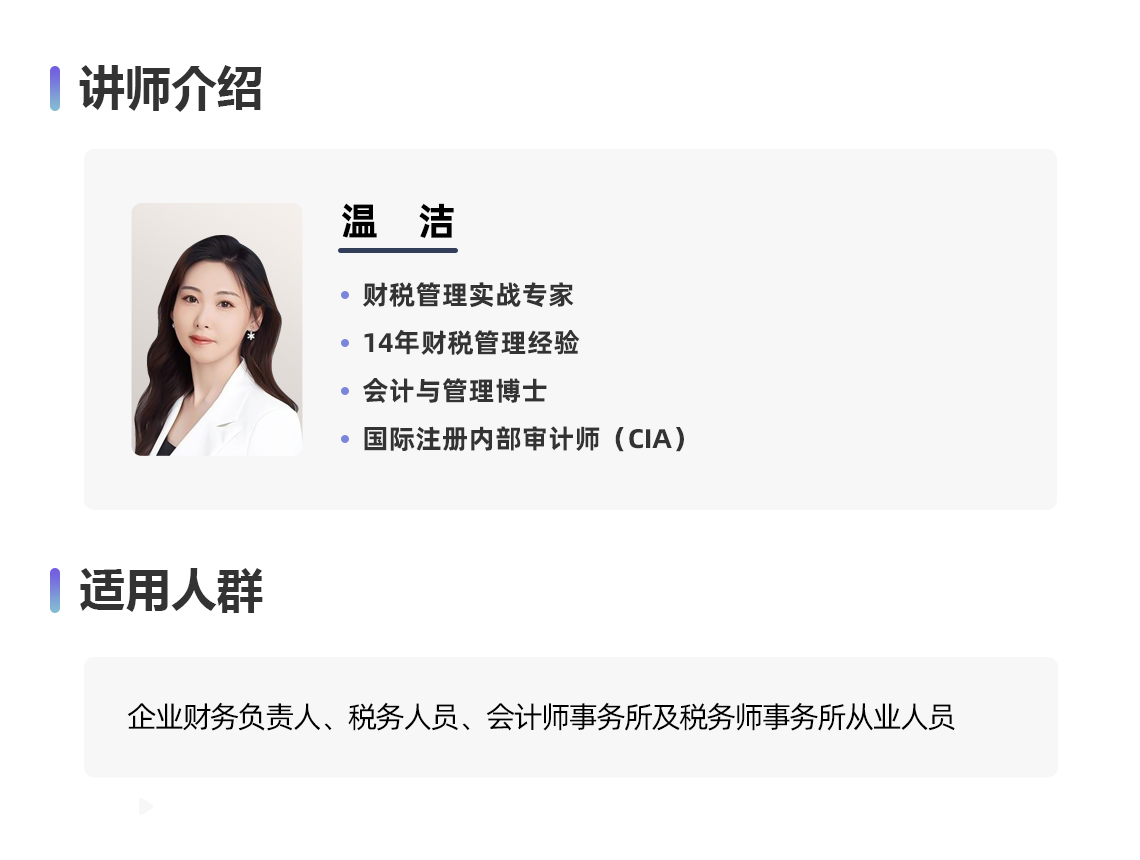 必修人群:企业财务负责人、税务人员、会计师事务所及税务师事务所从业人员