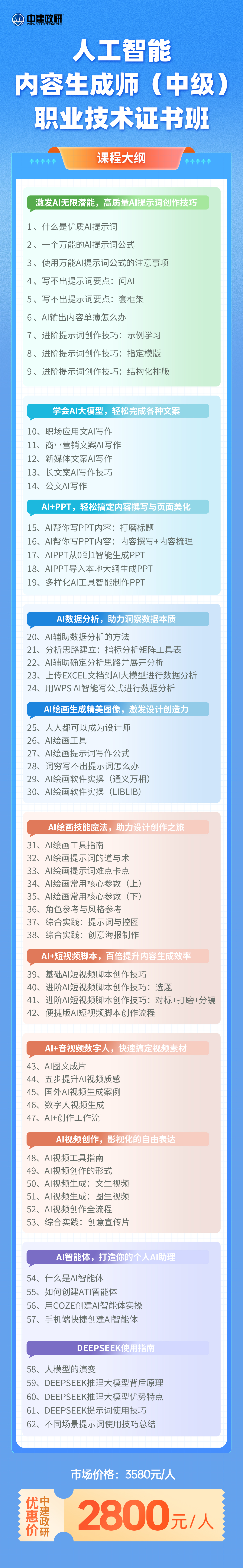 在数字经济与人工智能技术深度融合的时代背景下,掌握并高效运用AIGC(人工智能内容生成)技术已成为提升个人与组织核心竞争力的关键。为积极响应国务院国资委关于“加快培养一批能够熟练掌握AI工具、勇于探索创新的实操型人才”的号召,满足央国企等大型企事业单位对AIGC复合型人才的迫切需求,我们特推出 《人工智能内容生成师(中级)证书班》在线训练营。本训练营旨在系统培养学员利用AI工具高效完成跨媒介内容生成与设计的综合能力,助力学员考取由工业和信息化部教育与考试中心颁发的权威 【人工智能内容生成师(中级)】职业技术证书,赋能职场提质增效与数字化转型。