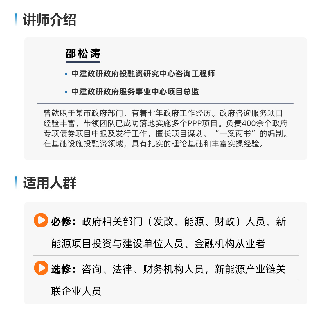 必修人群:政府相关部门(发改、能源、财政)人员、新能源项目投资与建设单位人员、金融机构从业者
