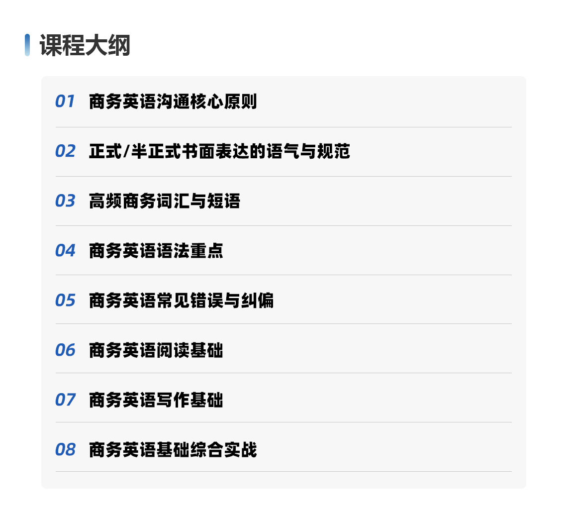 本课程立足国内企业的国际化业务发展刚需,以 “夯实基础、规范标准、规避风险” 为核心,为储备人才与国际业务线员工搭建系统化的商务英语基础体系,筑牢企业海外业务拓展的语言根基。