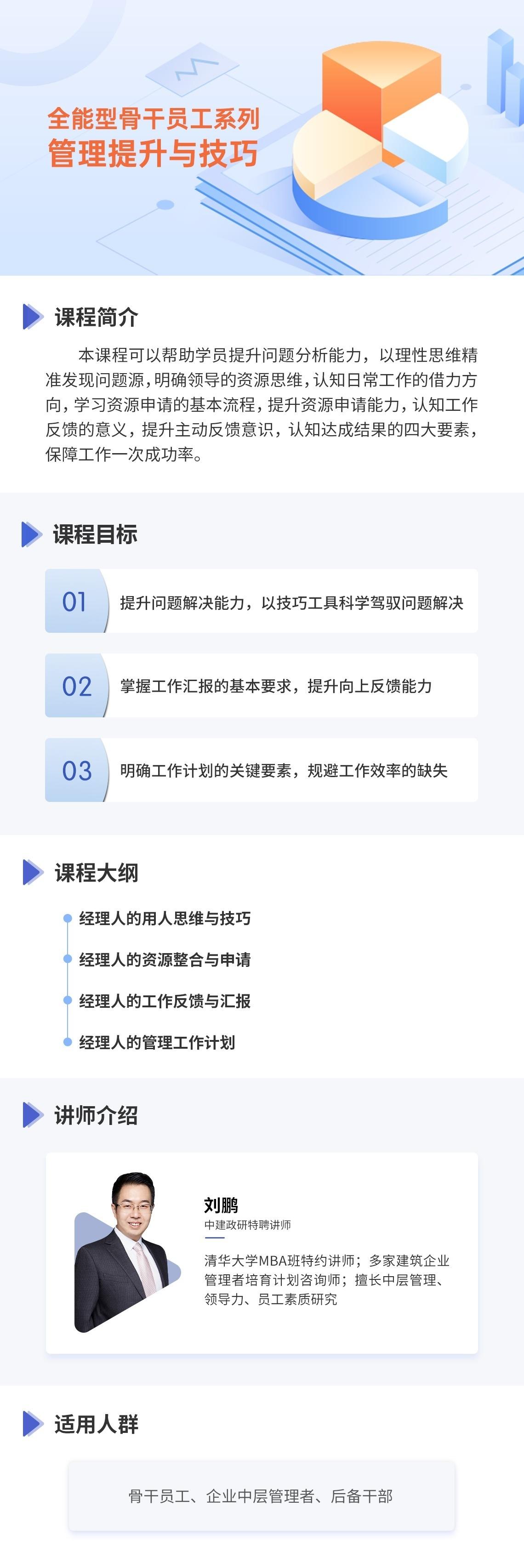 本课程可以帮助学员提升问题分析能力,以理性思维精准发现问题源,明确领导的资源思维,认知日常工作的借力方向,学习资源申请的基本流程,提升资源申请能力,认知工作反馈的意义,提升主动反馈意识,认知达成结果的四大要素,保障工作一次成功率。