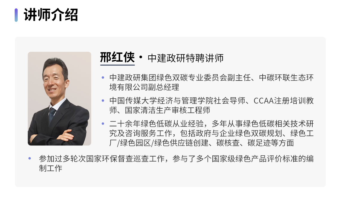 本课程帮助企业了解双碳中近零碳园区的相关政策和当前国内近零碳园区创建工作开展的情况,让企业了解各地政府、园区如何参与近零碳园区的创建工作,进一步让企业掌握近零碳园区建设的实施路径和关键步骤。
