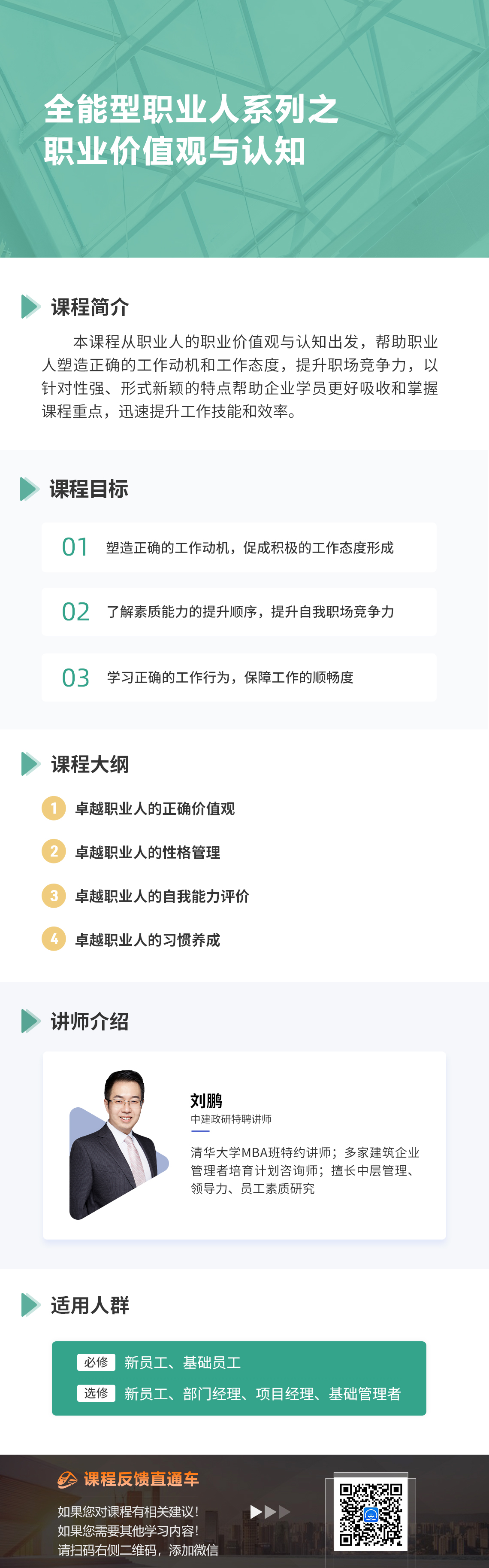本课程从职业人的职业价值观与认知出发,帮助职业人塑造正确的工作动机和工作态度,提升职场竞争力,以针对性强、形式新颖的特点帮助企业学员更好吸收和掌握课程重点,迅速提升工作技能和效率。